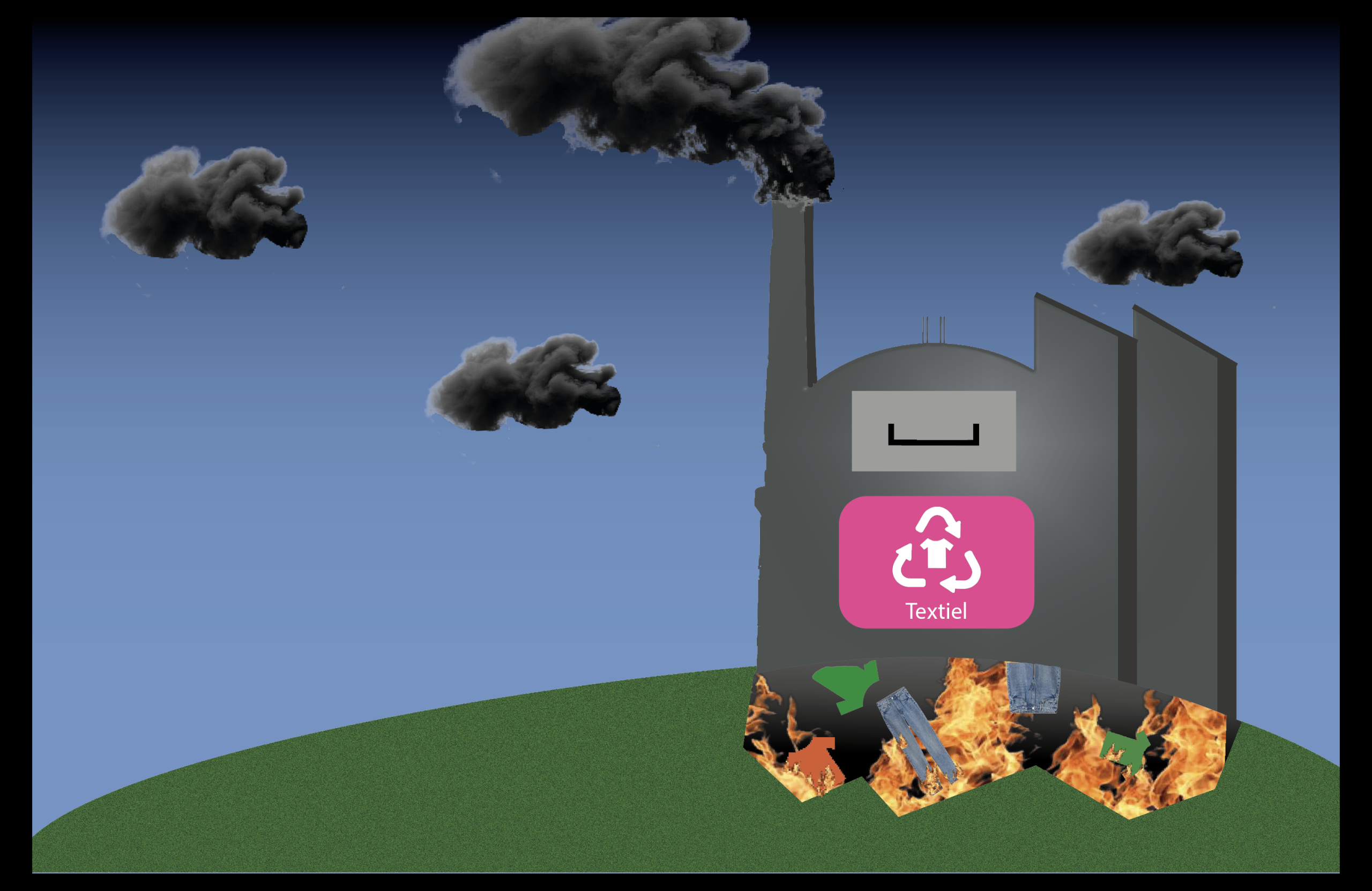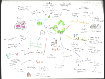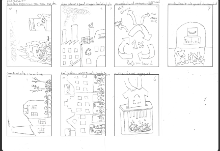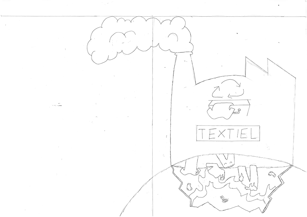 Ik begon met het maken van een woordweb waar ik alle associaties bij het woord recyclen opschreef. Deze associaties verwerkte ik in mijn cover schetsen. Uiteindelijk heb ik voor schets 7 gekozen, maar ik er kon volgens de feedback wat meer textielindustrie in verwerken wat er uiteindelijk toe heeft geleid dat de textielcontainer in in een fabriek veranderde. Na de aanpassingen heb ik de schets in illustator uitgewerkt.