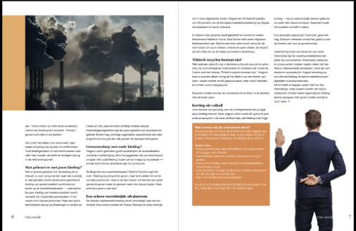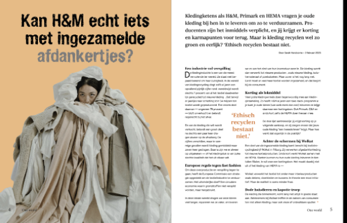 Voor dit project moest ik een magazine maken voor OneWorld die de aandacht van jongeren trekt. OneWorld is een organisatie die meer bewustzijn wil brengen over problemen overal op de wereld, met als hoofdonderwerpen: klimaat, identiteit en mensenrechten. Helaas lezen weinig jongeren de magazines en het is mijn taak dat te veranderen d.m.v het make van een cover en twee spreads over een gekozen artikel. Die van mij was:’Kan H&M echt iets met ingezamelde afdankertjes. Dit artikel gaat over de waarheid achter recyclen.
